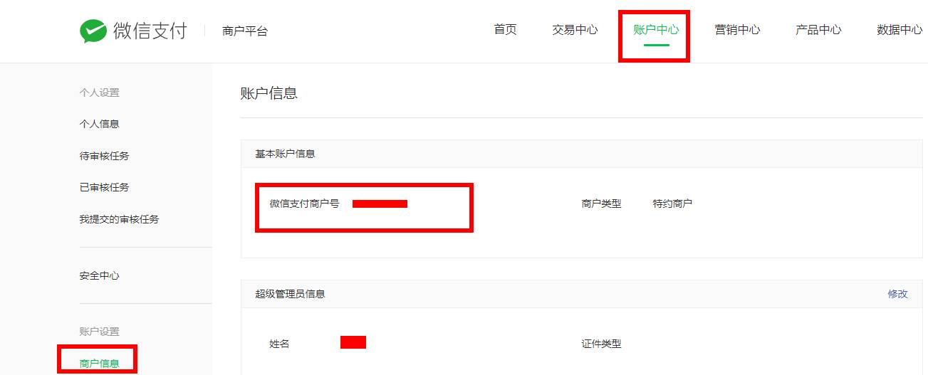 进入微信商户平台的「账户中心」→「商户信息」页面,即可找到商户号(mch_id),具体位置参考图示: