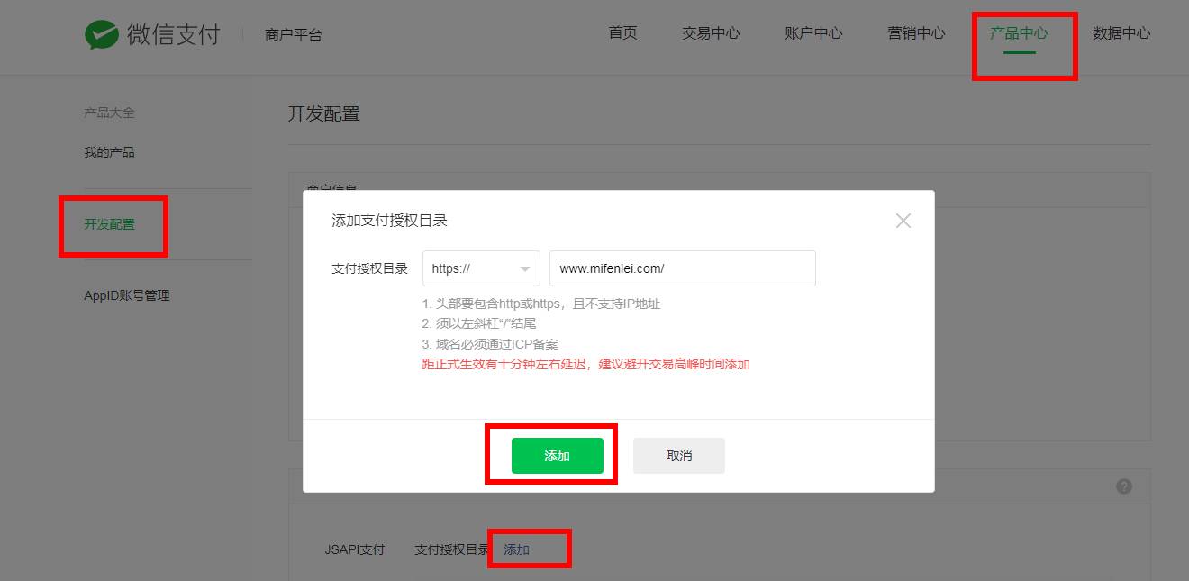 获取核心信息后,需回到微信商户平台配置JSAPI支付的开发参数,路径为:「产品中心」→「开发配置」,找到“JSAPI支付”相关配置项并完成设置,具体操作参考图示: