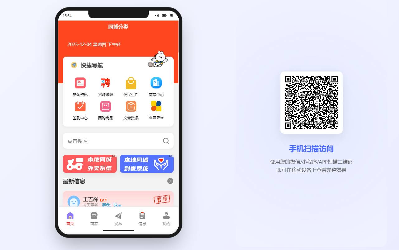 - 推广功能:支持信息付费刷新(后台设置刷新金额)、付费置顶(提供5天/30天/120天等套餐,价格可后台配置,支持叠加购买),提升信息曝光位置;