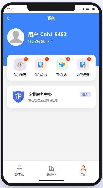 - 简历创建:支持按后台配置的数量上限创建简历,可完善多维度资料(基本信息、求职意向、教育经历、个人优势、个人作品、工作经历等);