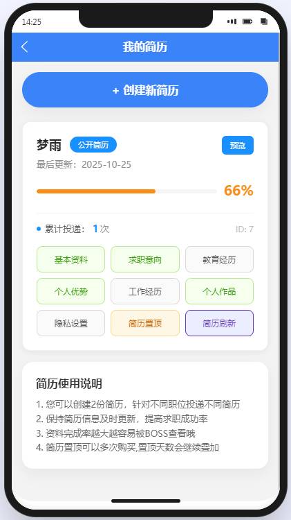 - 曝光优化:支持简历置顶(置顶后优先展示)、简历刷新(刷新后提升排序)功能,增强简历竞争力;