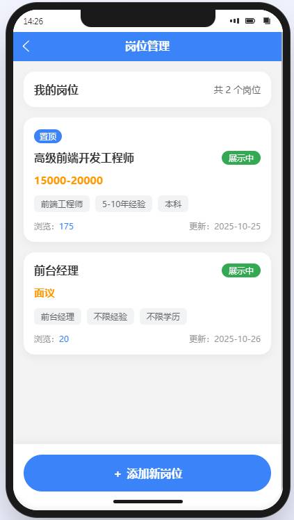- 核心操作:提供岗位添加、编辑、置顶、加急、刷新、删除等全流程管理功能;